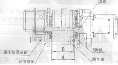 4、在懸掛軸上裝外部用調節墊圈。在懸掛軸上安裝軸狀限位銷,并將開口銷插入軸狀限位銷上。安裝軸狀限位銷,使得從小車開關盒的前方能夠看到開口銷在左側。
