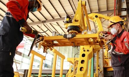 華剛礦業(yè)一期焙燒系統(tǒng)投入運行后,采用汽車吊的方法加硫磺,僅吊車費每個月就得上萬美元。技術(shù)人員經(jīng)過反復(fù)研究,建議在原廠房結(jié)構(gòu)上設(shè)計伸出一個鋼結(jié)構(gòu)懸臂,懸臂上安裝一個電動葫蘆,就地取材,用zui小的代價解決硫磺吊裝的難題。